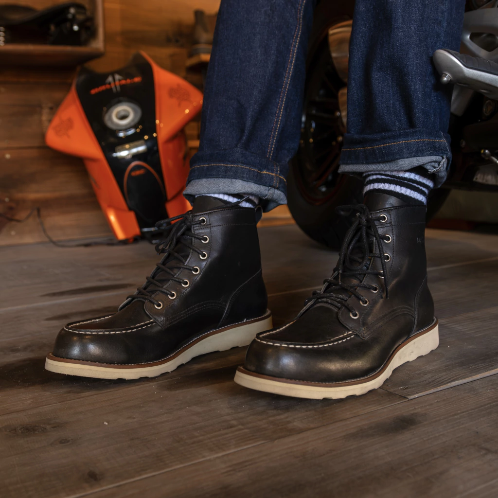 O design da bota Moc Toe Machina apresenta uma ponteira moc toe (ou bico de mocassim), conferindo um toque de estilo e personalidade à bota. Os detalhes artesanais e as costuras resistentes completam o visual clássico e atemporal.